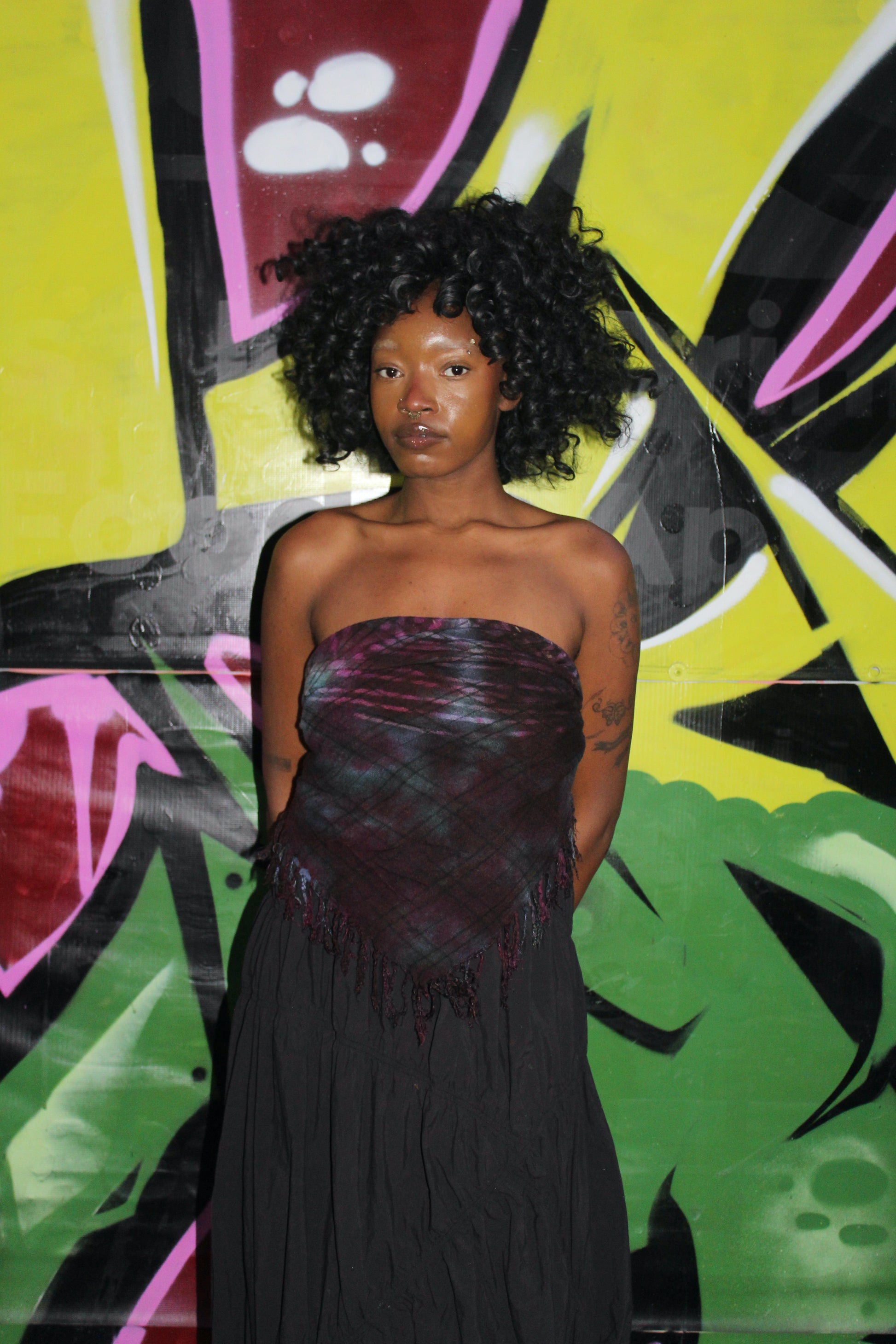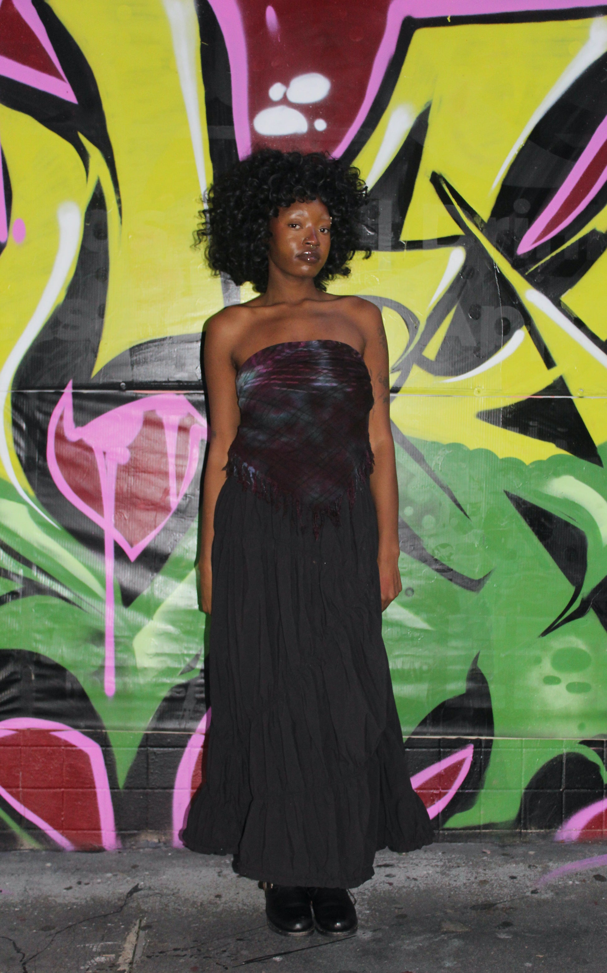 Hand-dyed scarf with tassels. Spiral portal motif.