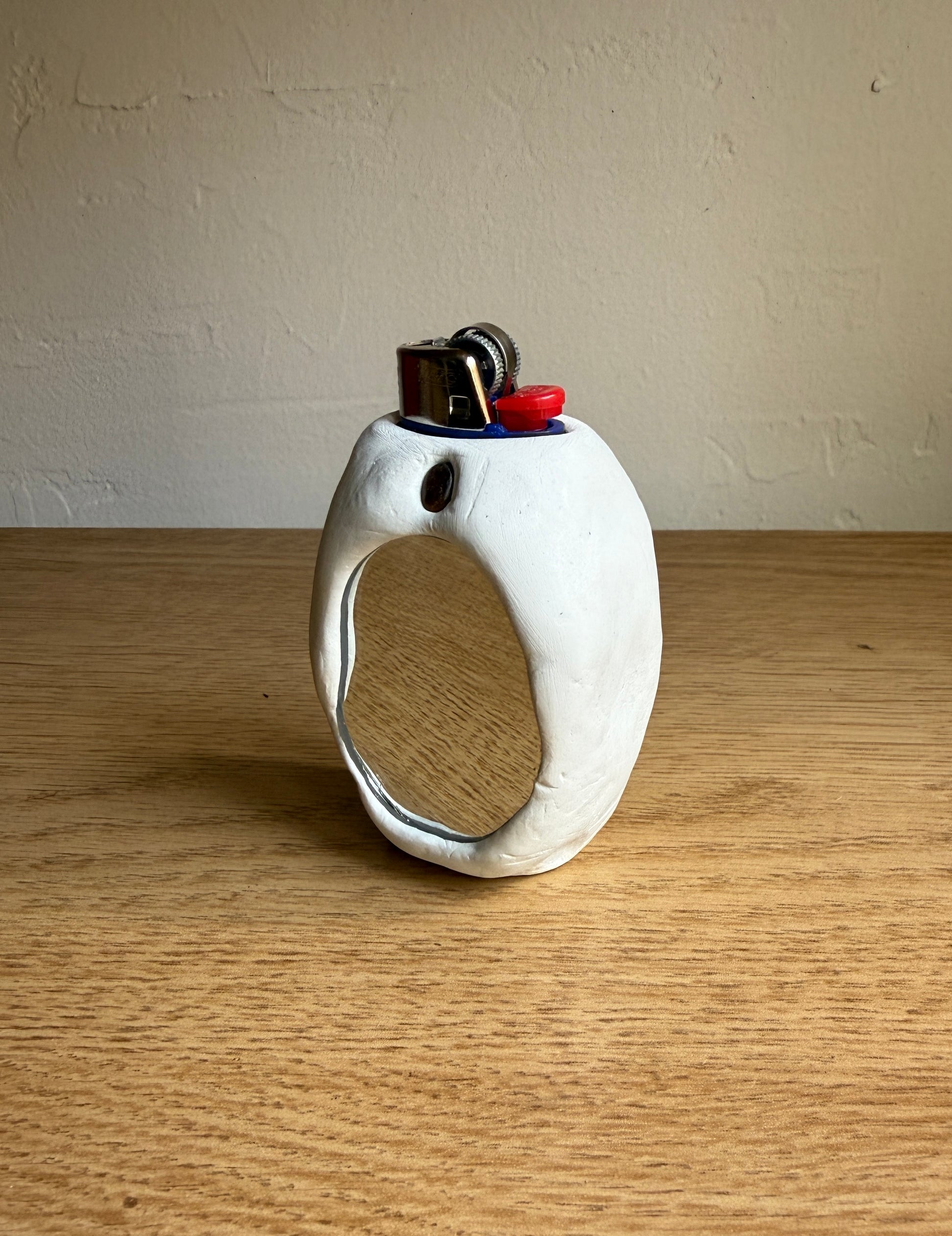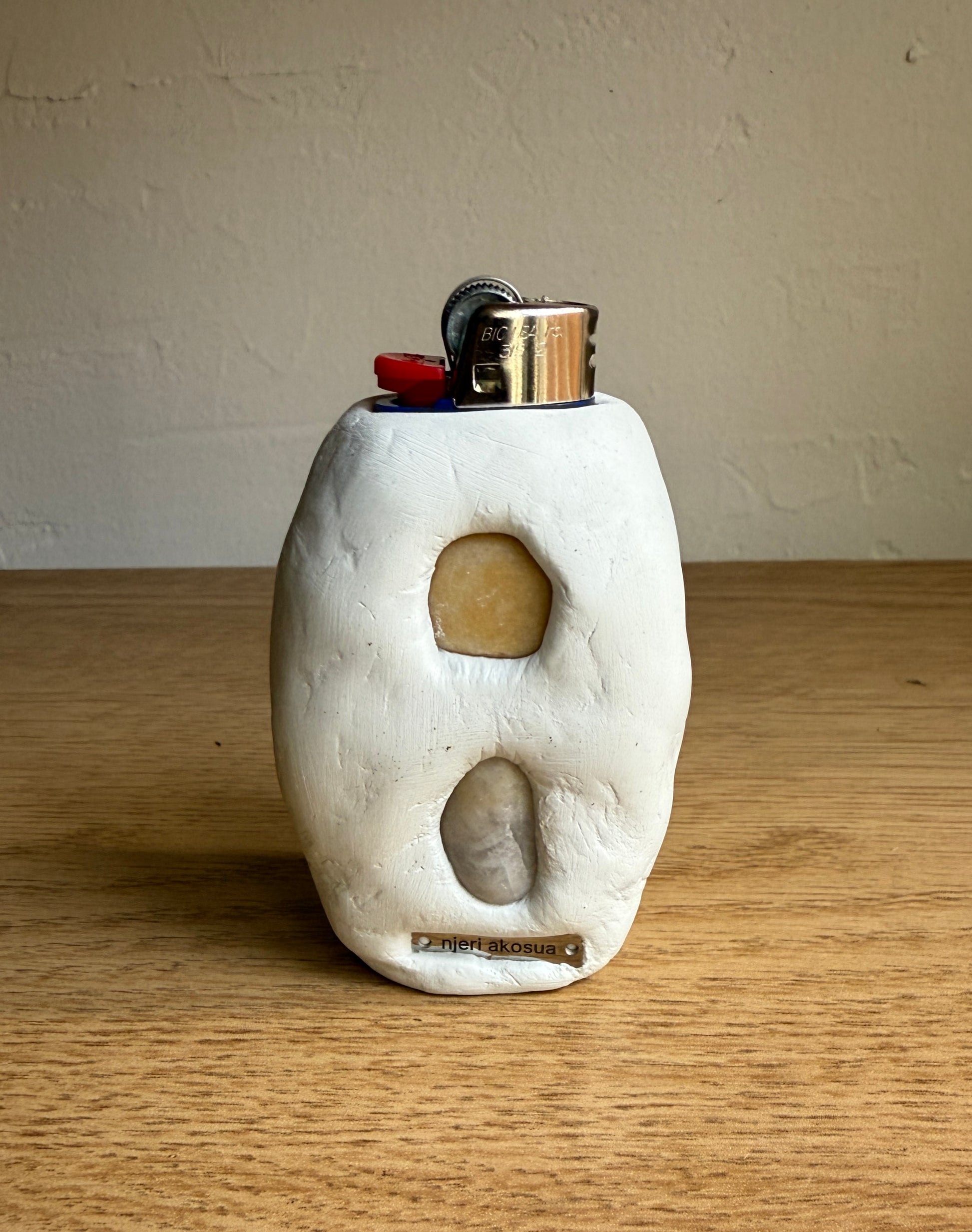 One large, hand-sculpted lighter case fits a standard BIC lighter. Smooth with a mirror and single, polished tigers eye stone on the front. The other side features two smooth beach stones. Handmade from professional-grade sculpting materials.