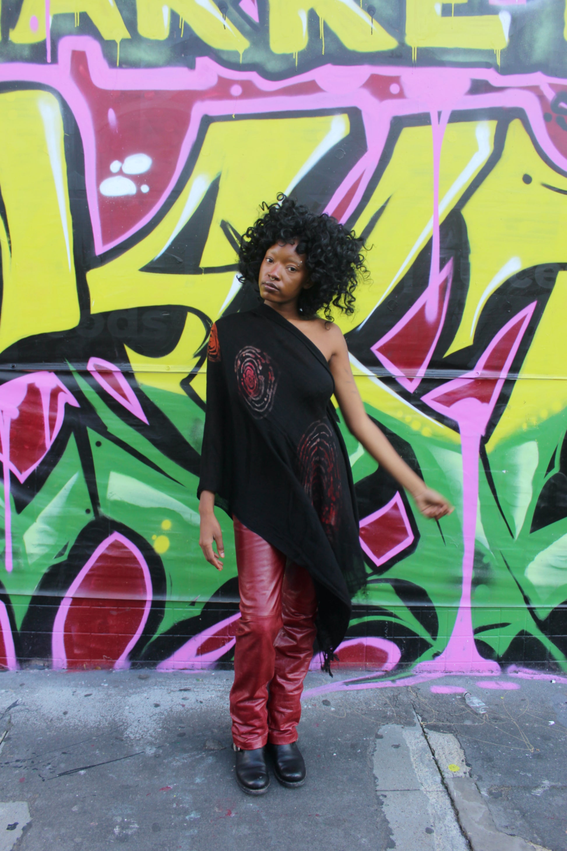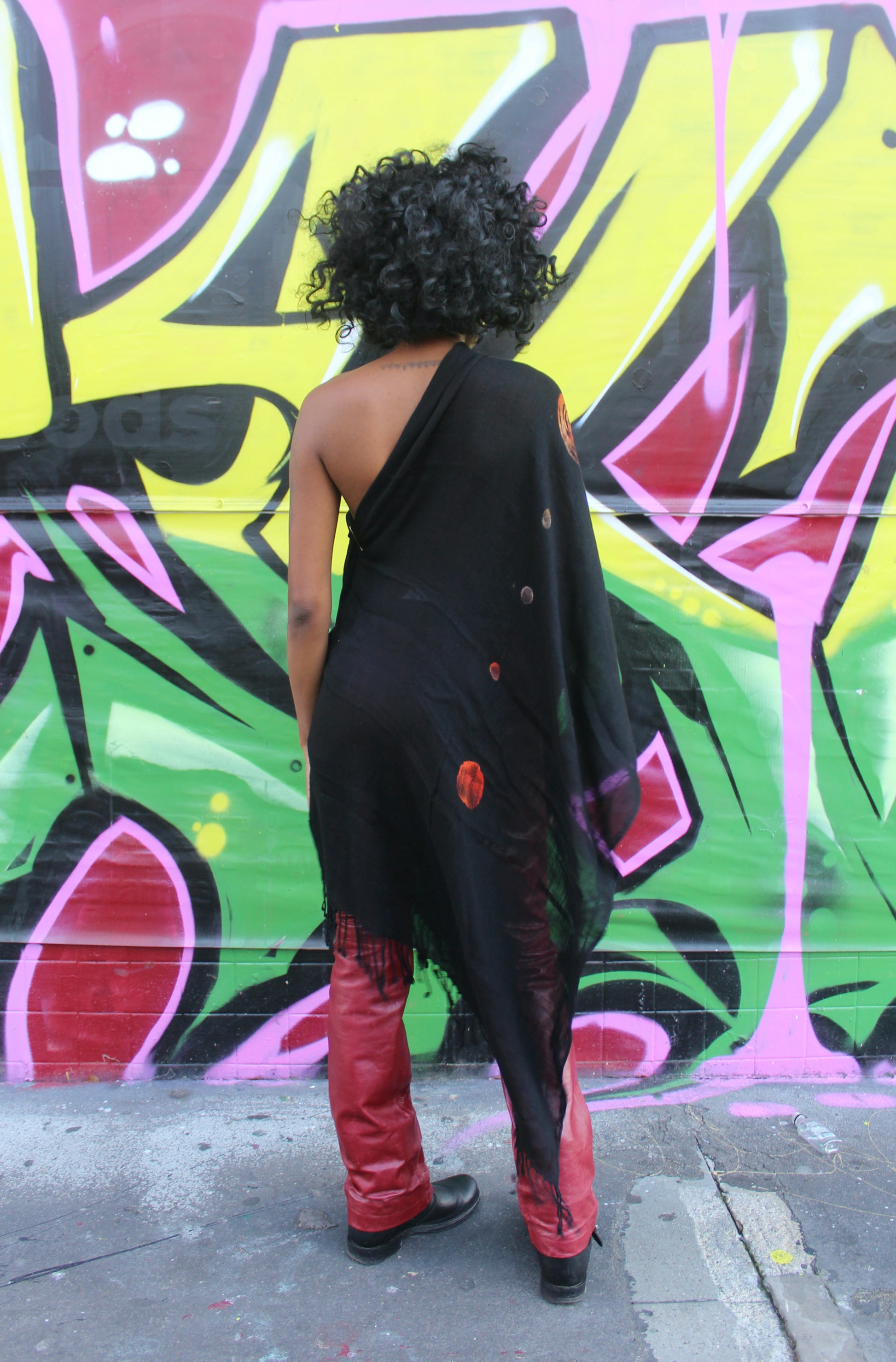 Large hand-dyed scarf. Features spiral portal motifs and a fluid, flowy material.