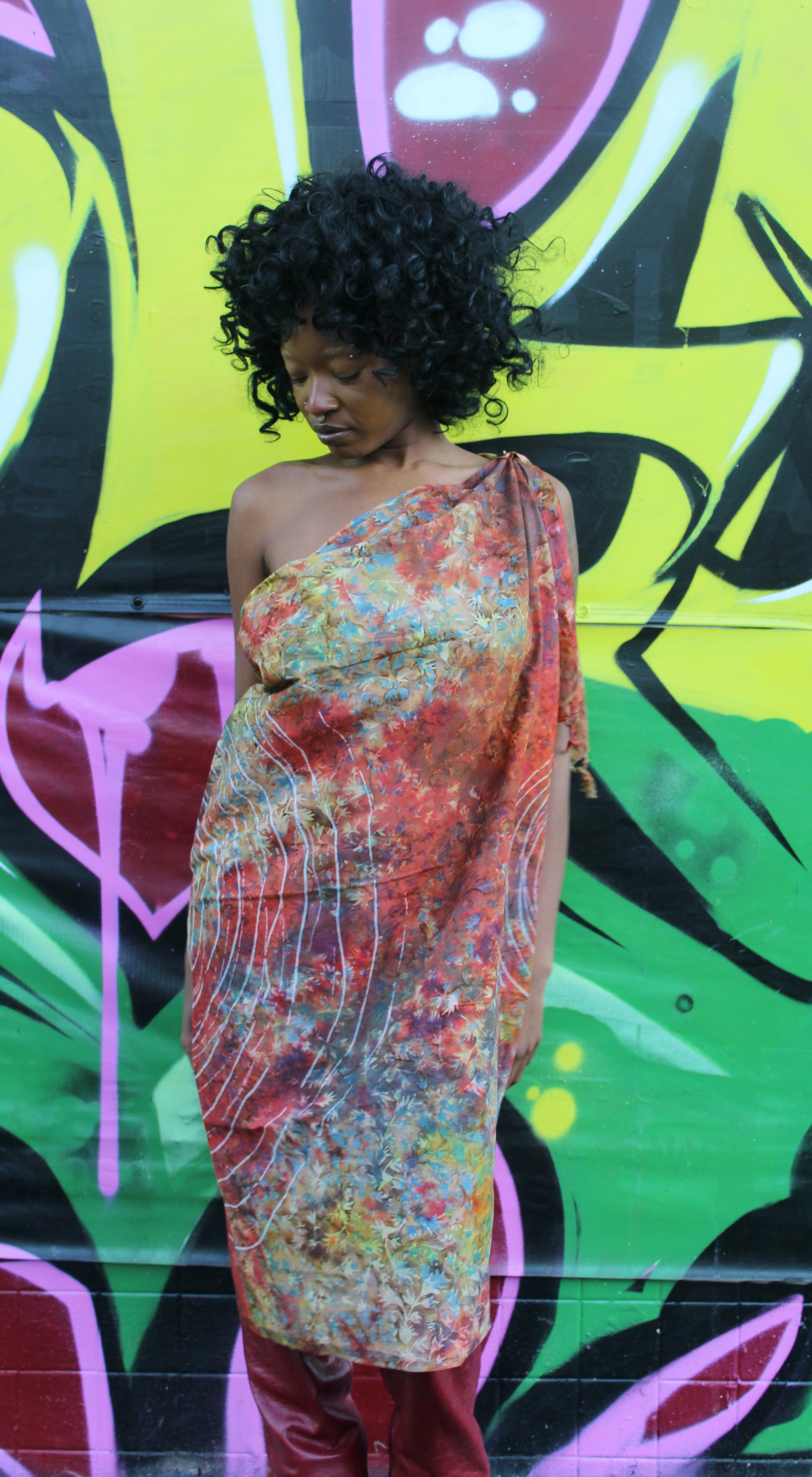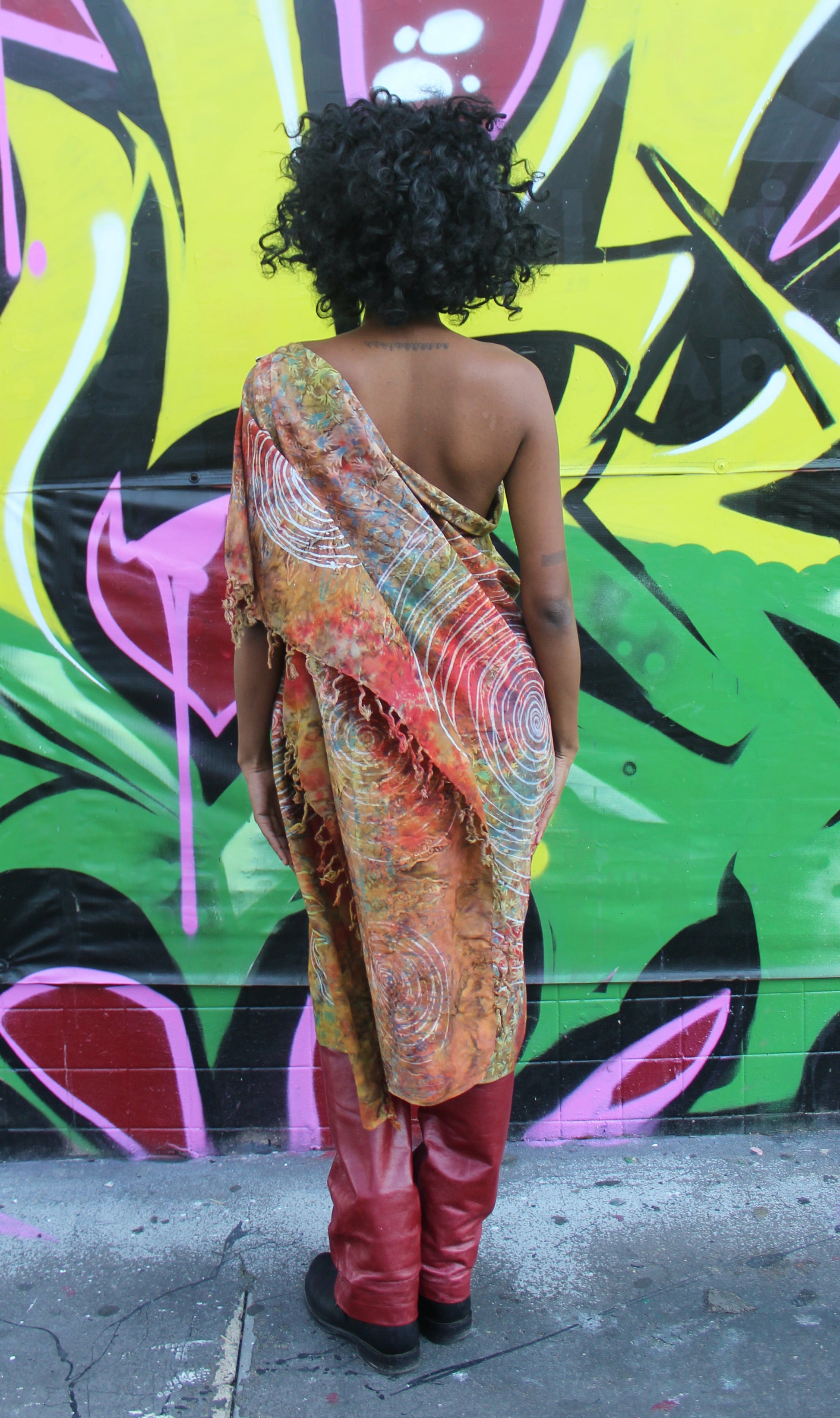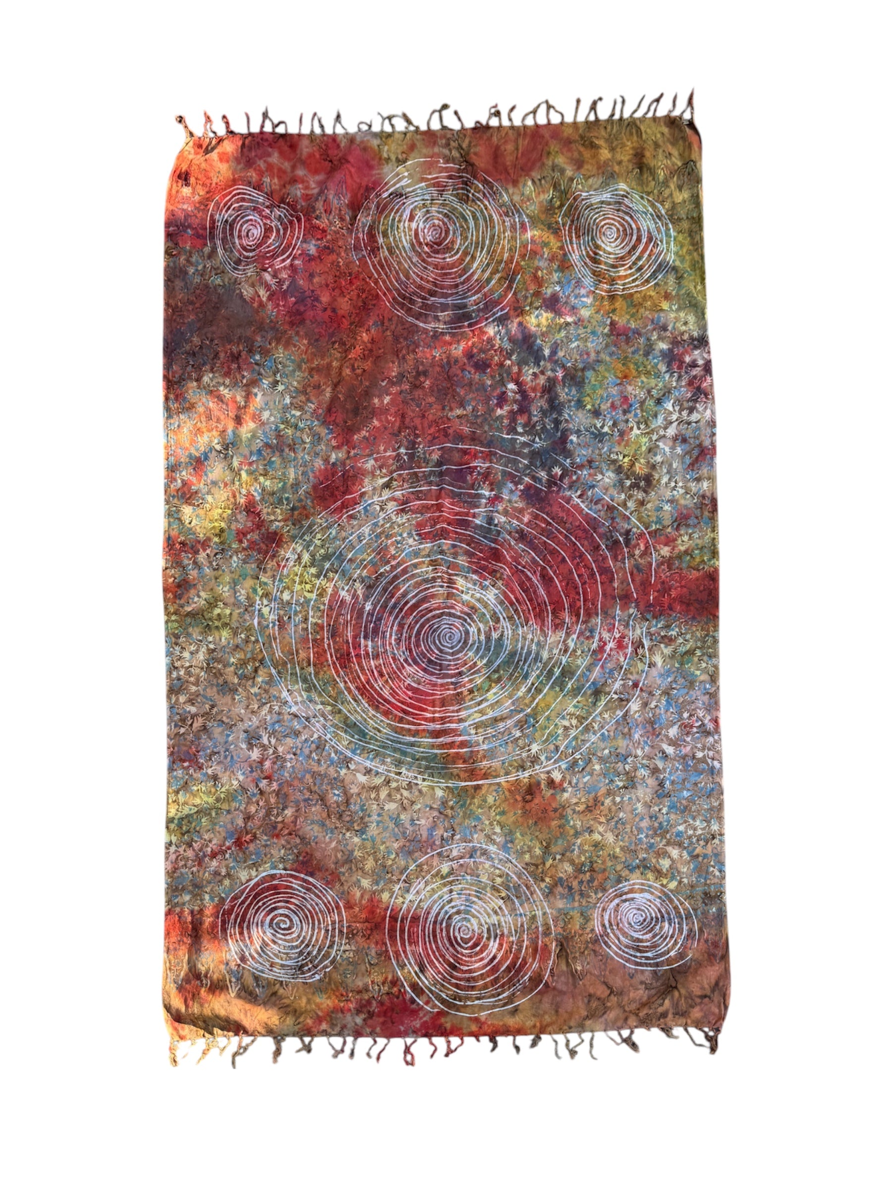 Extra large hand-dyed scarf. Features spiral portal motifs and can be worn and used many ways.